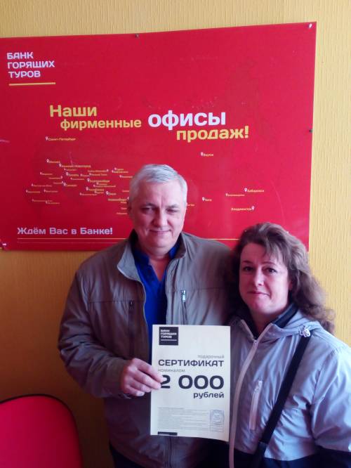 Второй раз обратились в Банк горящих туров, первый раз был успешным, довольны обслуживанием, всё быстро!!!) В будущем ждем такого же обслуживания, больше туров, скидок клиентам!...
