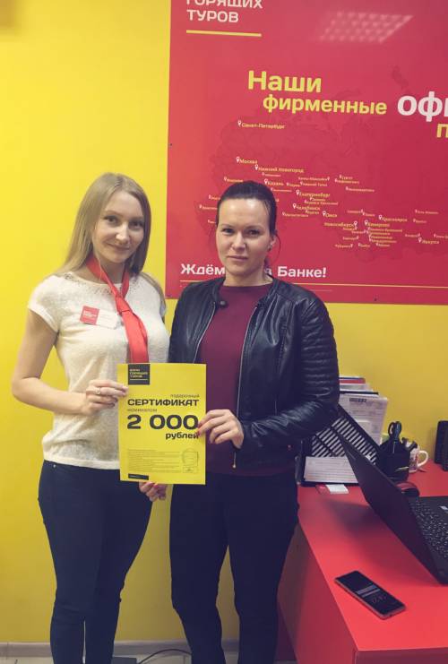 По совету друзей обращались в первый раз, сейчас пришли уже во второй, т. к. все устраивает и сервис, и сайт очень удобный. Желаем вам в дальнейшем побольше клиентов и выгодных тур...